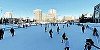 The Rink of Dreams is a 1161 square metre or 12,500 square-foot outdoor refrigerated ice surface. The plexiglass around the surface is lighted with different colours. Unfortunately, the time frame meant I had to shoot the pano before the lights came on.